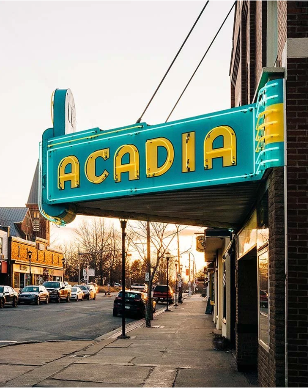 A cozy local theatre showing indie films, classics, and occasional live performances.